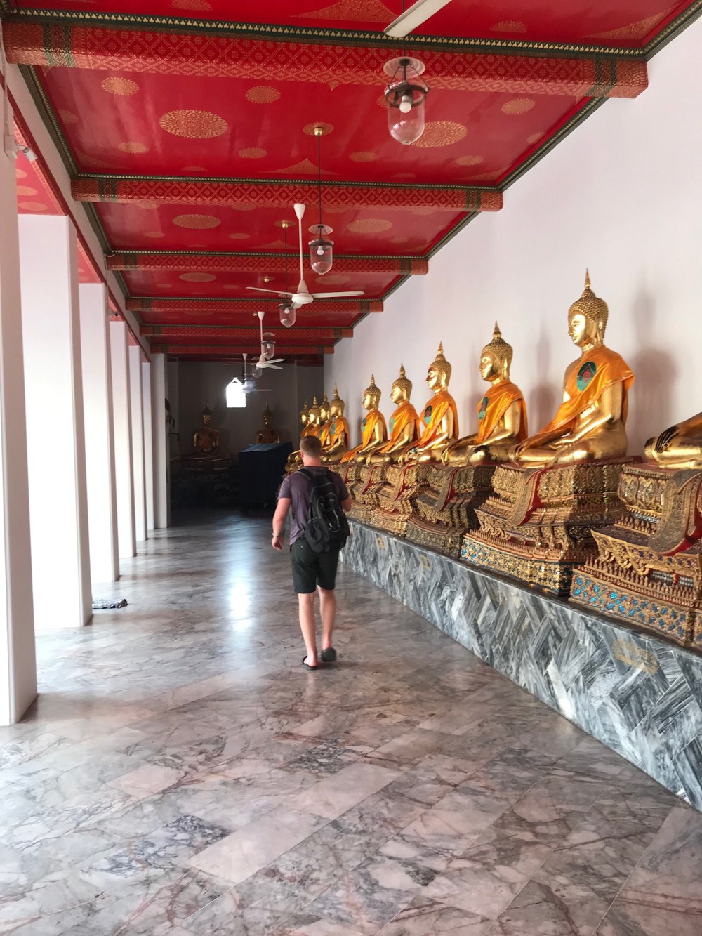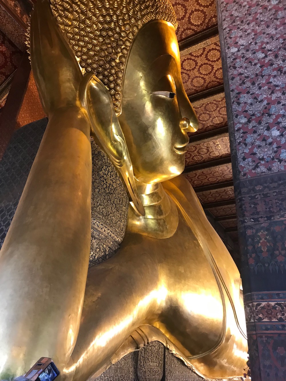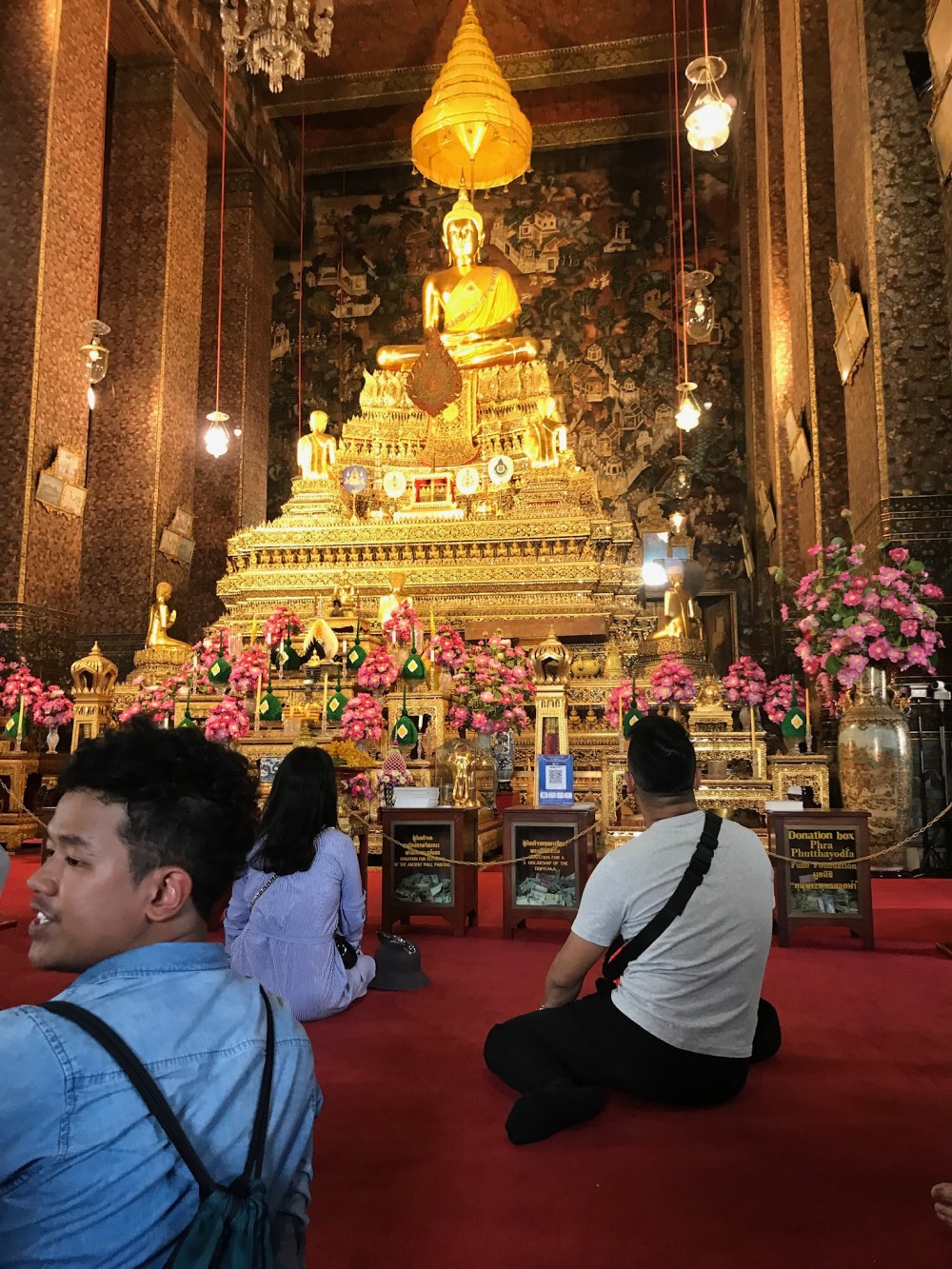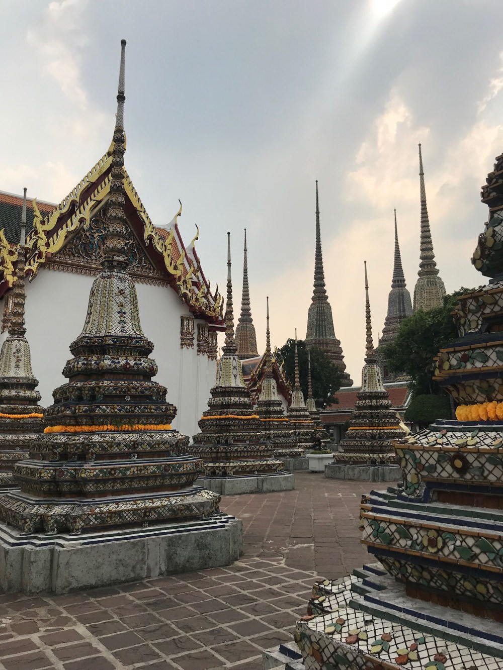 We spent our first evening on Ko San Road which is as crazy as people say it is. That evening I had to cut short because I was jet lagged and my allergies started to hit me. My allergies have been worse than home, which I think is from the pollution mostly. I had never seen a sky so hazy. The day after a good nights sleep and popping allergy pill to breathe properly, we got to go to the Wat Po Temple (I recommend googling it to see it for yourself). This temple is massive, it has 99 Stupas; the pointed towers scattered around. The stupas hold the ashes of loved ones if you pay for a spot in one. There are also Buddha’s everywhere. There are two massive ones ; the reclining Buddha and the Buddha that is being protected by snakes ; the story goes back to when Buddha was on his path to enlightenment and was meditating in a forest when a storm came in. The snake decided to protect Buddha from the rain. There is so much detail on everything right from the walls and gates to get in.